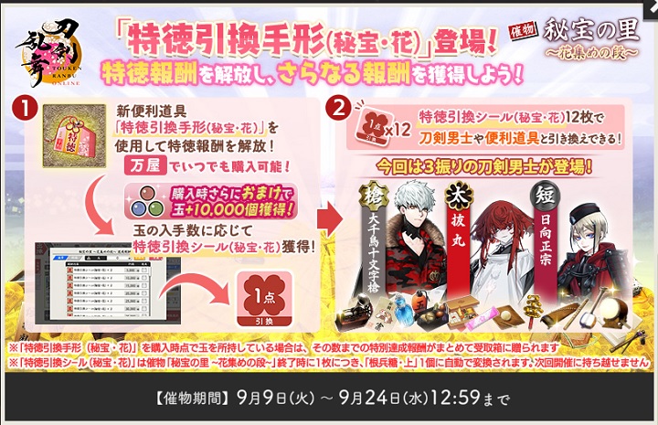 特徳引換手形(秘宝・花)を万屋で購入すると、催物「秘宝の里 ~花集めの段~」の特徳報酬を即時解放することができます。