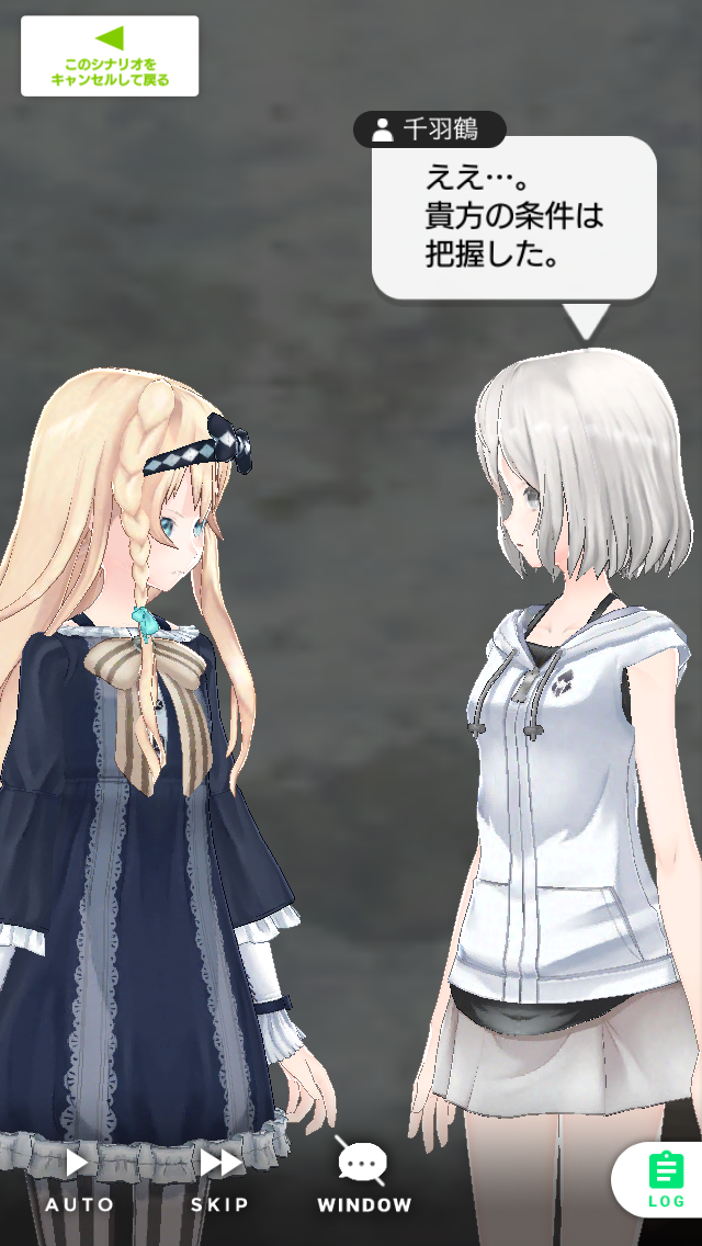 - B."彼ら"の思想に共感し、プレイヤーに興味を持った"彼ら"と交渉して彼女たちを守る(あるいは守らず"彼ら"に全面協力する)。
