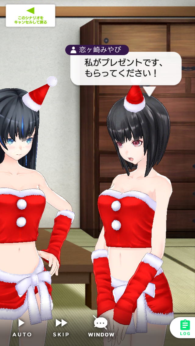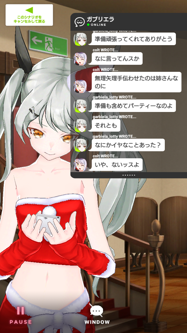 無事に真幌から許可を得て、「どうせパーティをするならクラン達にも声をかけて盛大にやるのはどうか」と提案される。真幌 あいつらも、私たちの仲間だからな。 隊員、クラン全員集合の、大クリスマスパーティーといこうじゃないか。 - 準備のために色々な買出しで必要なものを求められるが、神楽は「衣装の方は用意します」と言う。