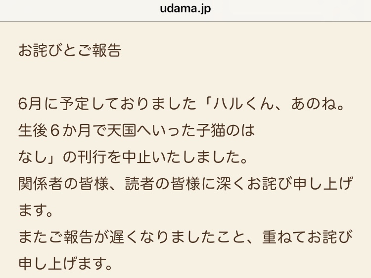 6月に予定しておりました「ハルくん、あのね。生後6か月で天国へいった子猫のは なし」の刊行を中止いたしました。 関係者の皆様、読者の皆様に深くお詫び申し上げます。 またご報告が遅くなりましたこと、重ねてお詫び申し上げます。