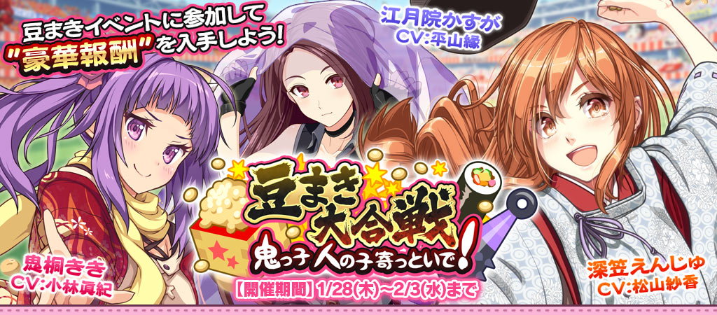 | 1位~100位 | 深笠えんじゅ(福娘のご奉仕スタイル) 鬼桐きき(本物鬼っ娘の豆まきモード) 江月院かすが(ザ・和洋折衷) ビーナスプラス3個 |
