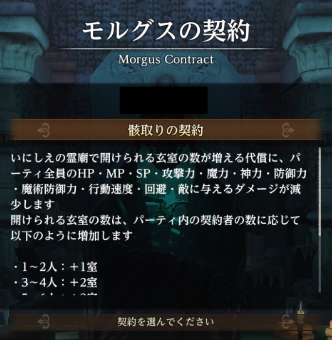 契約者の数に応じて開けられる箱の数が増えるが、パーティ全員の能力値が下がる。