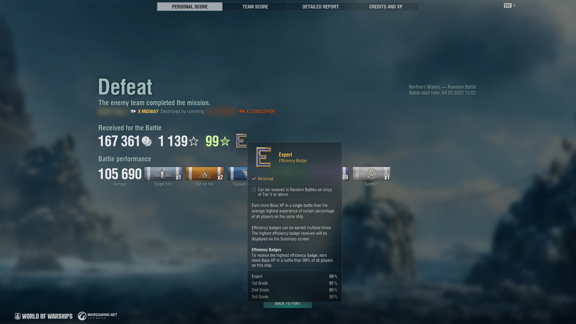 - バッジはランダム戦でTier5以上の艦艇を使用した場合にのみ授与される。