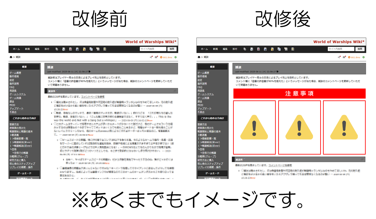 現在、雑談板下部のコメントボックスの更に下に注意喚起の文言が記載されているかと思います。この注意喚起を雑談板の最上部に移動させる予定です。また、この注意喚起は雑談板利用者全ての方が目に留まるようなサイズの大きなものに変更したいと考えております。また、注意書きの中にゲーム内の質問(オススメ艦艇の質問や戦闘の質問など)は同じ質問が繰り返し投稿され、荒れる傾向にある事から専用の掲示板に誘導するようなリンクも掲載する予定です。