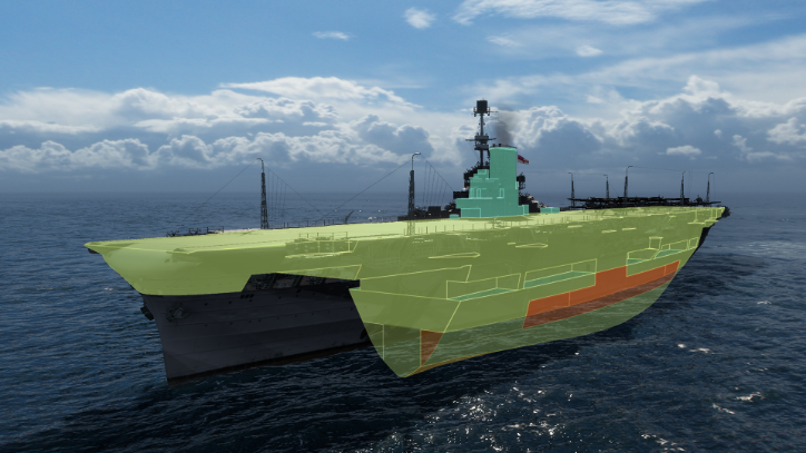 英国空母独特の装甲は健在。500ポンド爆弾の急降下爆撃や炸薬量750ポンドの魚雷攻撃に耐え、水防・水密区画や機関のシフト配置、弾薬庫・航空燃料庫の位置にもかなり拘っている。