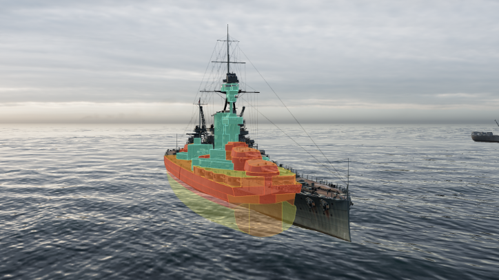 最終船体で47100とやや控えめ。同格日本戦艦金剛よりかは固いが、横を見せると大ダメージを食らう。修理班は火災ダメージを100%回復出来るため、しぶとく戦っていこう。艦首・艦尾に伸びた装甲帯も活用すると良い。 - 隠蔽性
