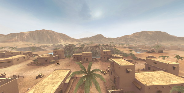 砂漠の平地に低層の市街地があり、中央にオアシスがあるマップ。