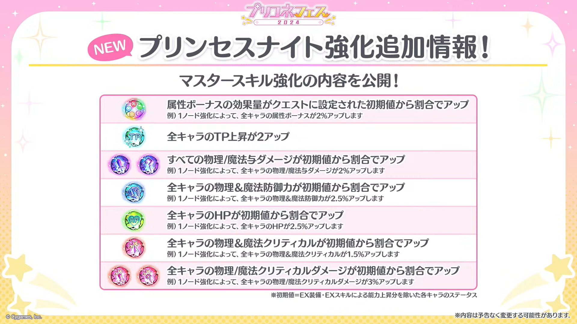 全キャラの ステータス・属性ボーナス効果量等が 初期値から割合でアップします☆