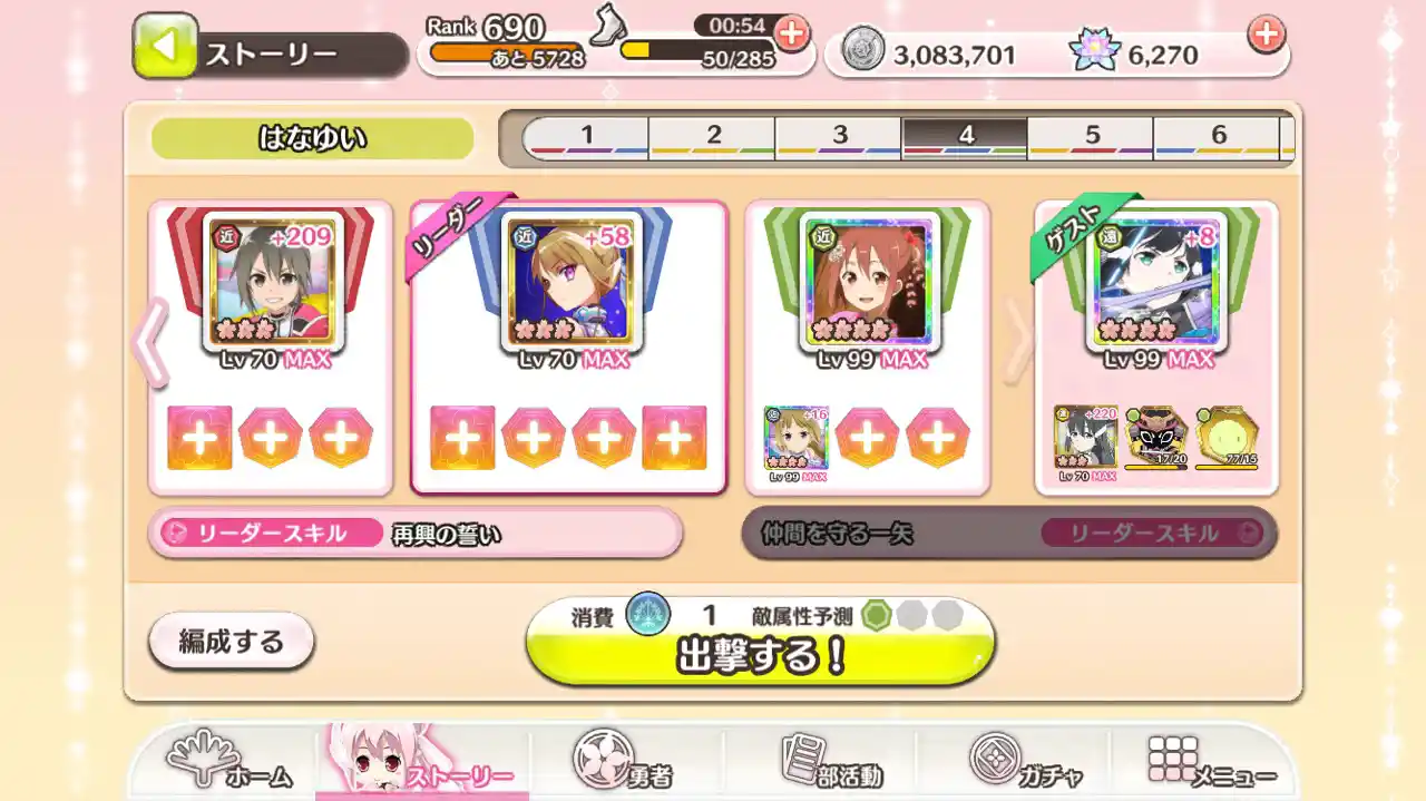 - 4段階目の神花解放で2枠目のサポート勇者枠が開放され、同一名称の勇者もつけられる(例:UR結城友奈のサポート2枠目にSSR結城友奈をつける)