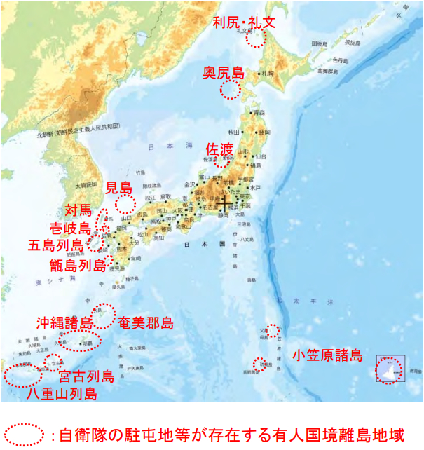 具体的には、北海道礼文島、奥尻島、新潟県佐渡島、小笠原諸島父島、硫黄島、南鳥島、山口県見島、長崎県対馬、海栗島、壱岐島、福江島、鹿児島県下甑島、奄美大島、沖永良部島、沖縄県久米島、宮古島、与那国島がこれに該当します。自衛隊基地の建設が進められている鹿児島県馬毛島も数年以内にはここに含まれる筈です。